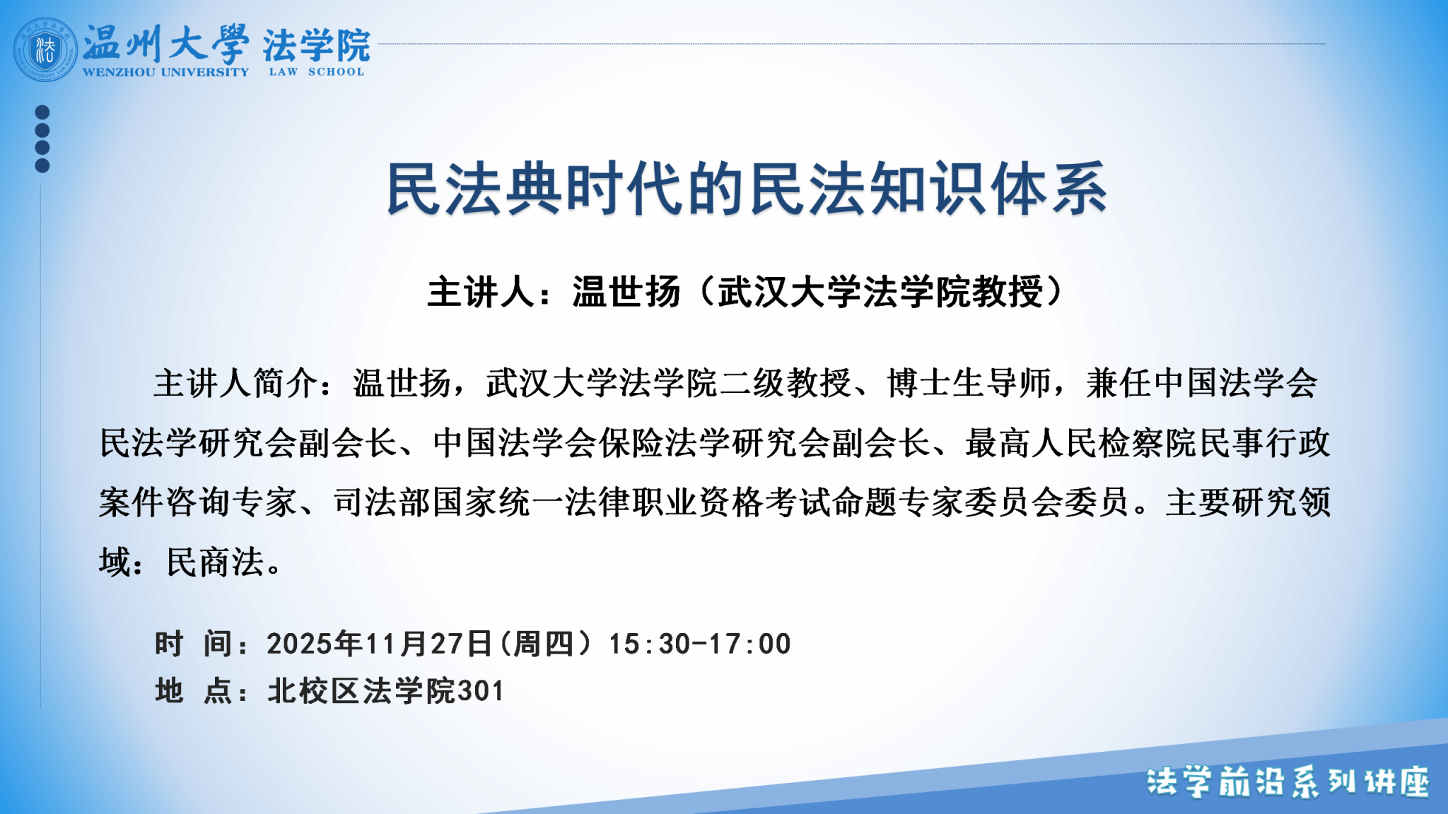 讲座预告|法学前沿讲座第三期第7讲:民法典时代的民法知识体系(11月27日)-凯发k8娱乐官网入口