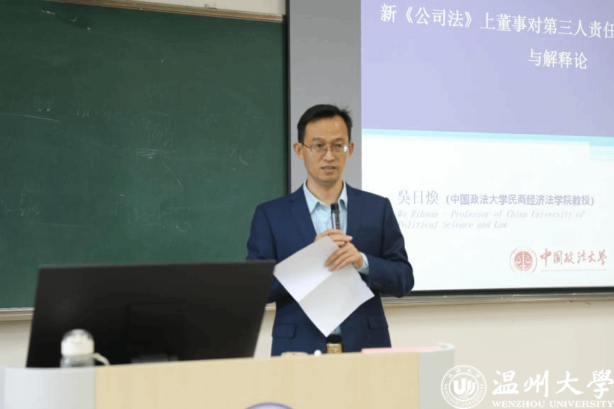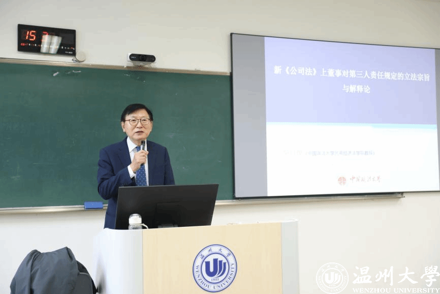 2025年11月14日下午,温州大学北校区法学院202教室座无虚席、气氛热烈,中国政法大学民商经济法学院教授、韩国法研究中心主任、前财税金融法研究所所长吴日焕应邀莅临,开展题为“新《公司法》上董事对第三人责任规定的立法宗旨与解释论”的专题讲座。本次讲座由法学院李勇军教授主持并致欢迎词,众多师生到场聆听学习,共同聚焦新《公司法》中的重要法律议题。