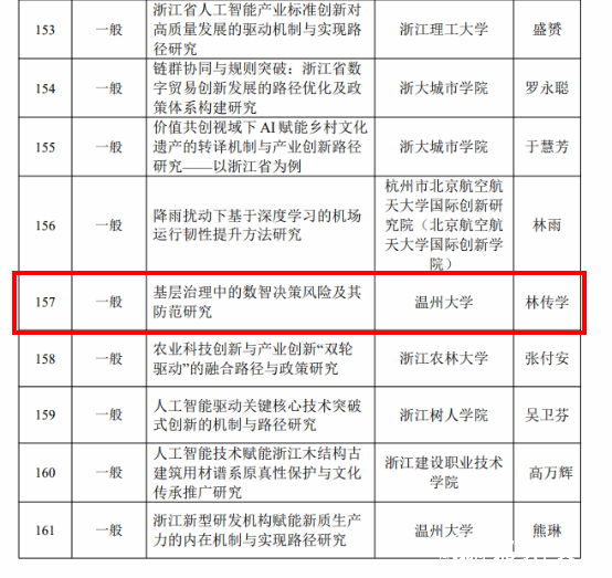 近日,浙江省科技厅公示了2026年度浙江省软科学研究计划项目拟立项名单,我院行管系林传学博士申报的《基层治理中的数智决策风险及其防范研究》成功获批立项。