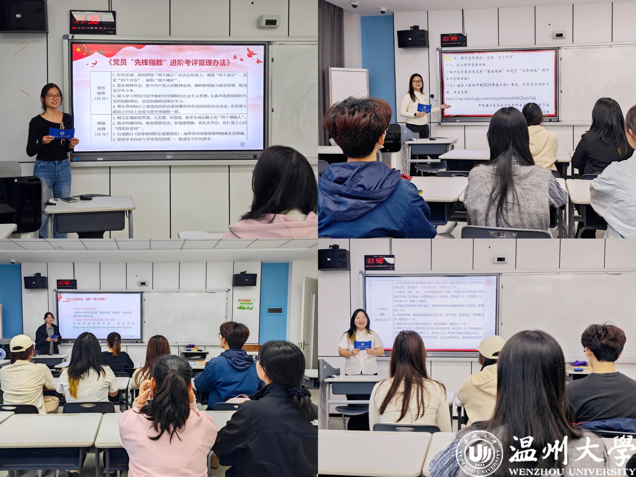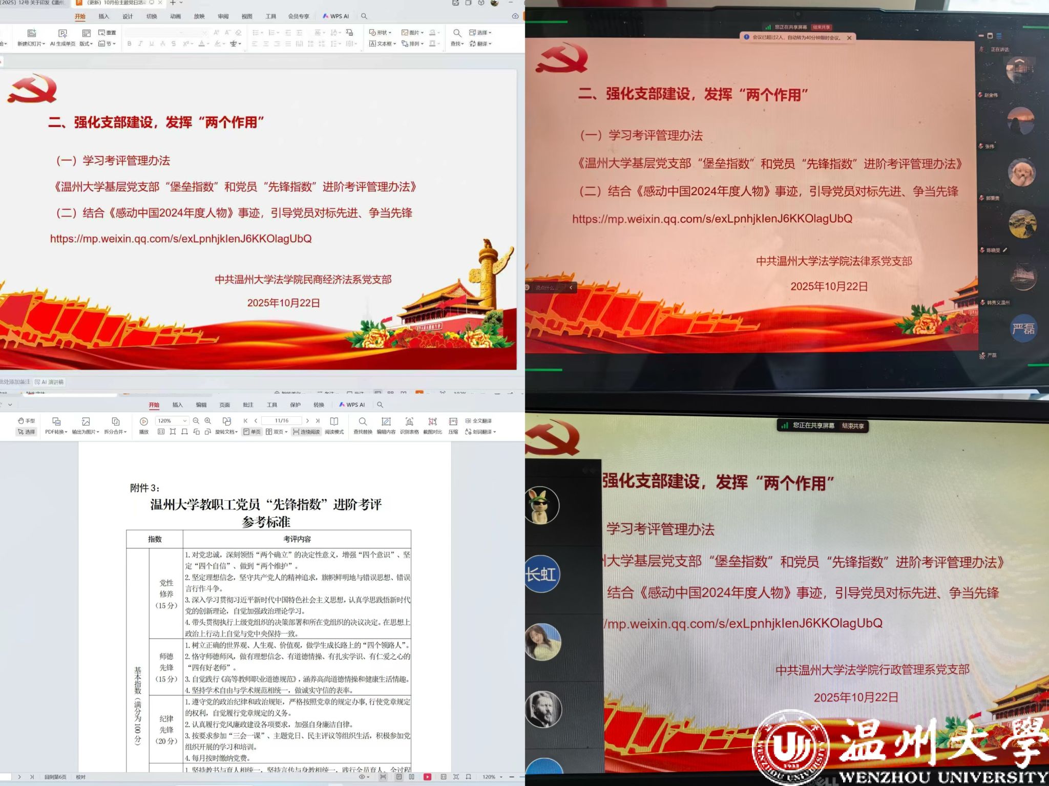 近日,为深入贯彻落实新时代党的建设总要求和新时代党的组织路线,进一步提升党支部组织力,强化政治功能,激发党员队伍生机活力,在温州大学法学院党委统一部署下,各党支部积极组织开展了《党支部“堡垒指数”和党员“先锋指数”进阶考评管理办法》(以下简称《办法》)的专题学习活动。