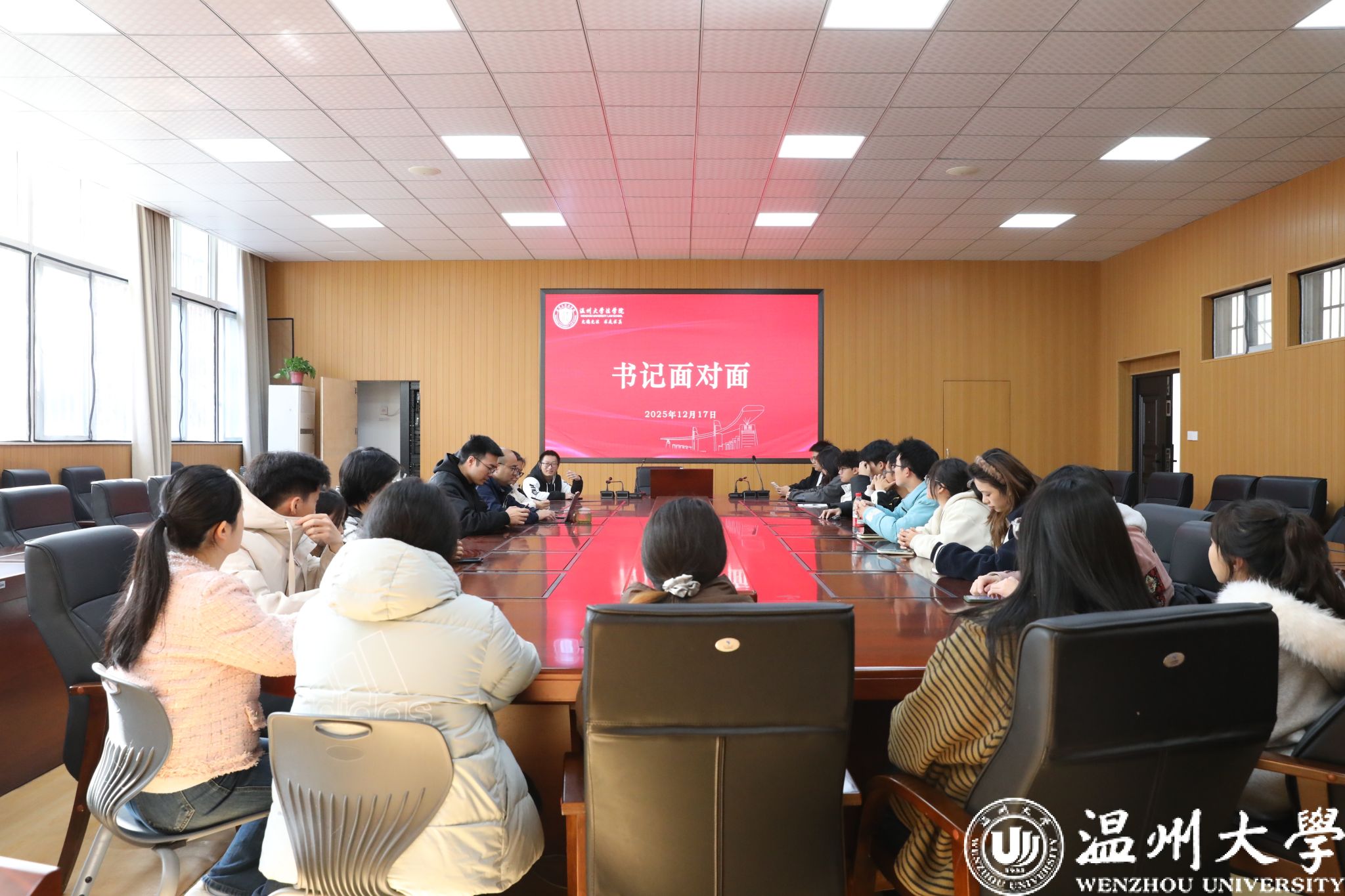 12月17日,法学院“书记面对面”新生座谈会在学院103会议室举行。本次活动旨在搭建学院领导与学生之间直接、高效的沟通桥梁,倾听学生心声,回应学生关切,切实解决同学们在学习、生活中遇到的实际问题。法学院党委副书记郑兆钧、教务科科长郑芳、团委副书记黄依瑶、辅导员蒋玮隽出席座谈会,与2025级本科生代表进行了深入交流。